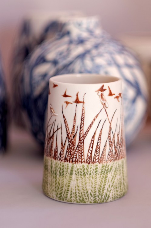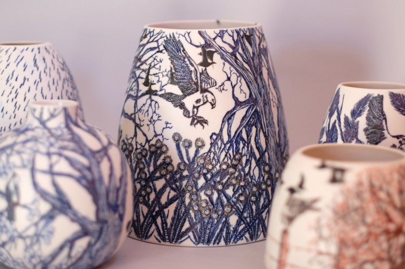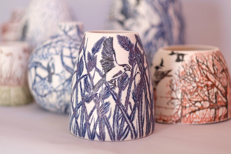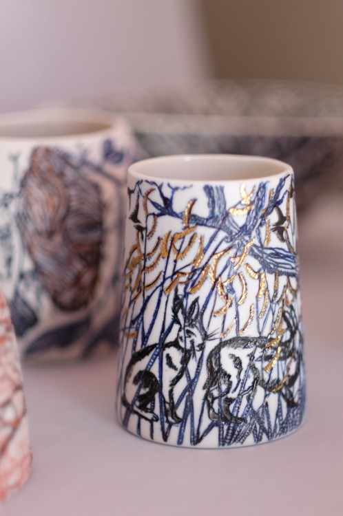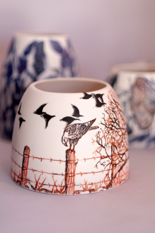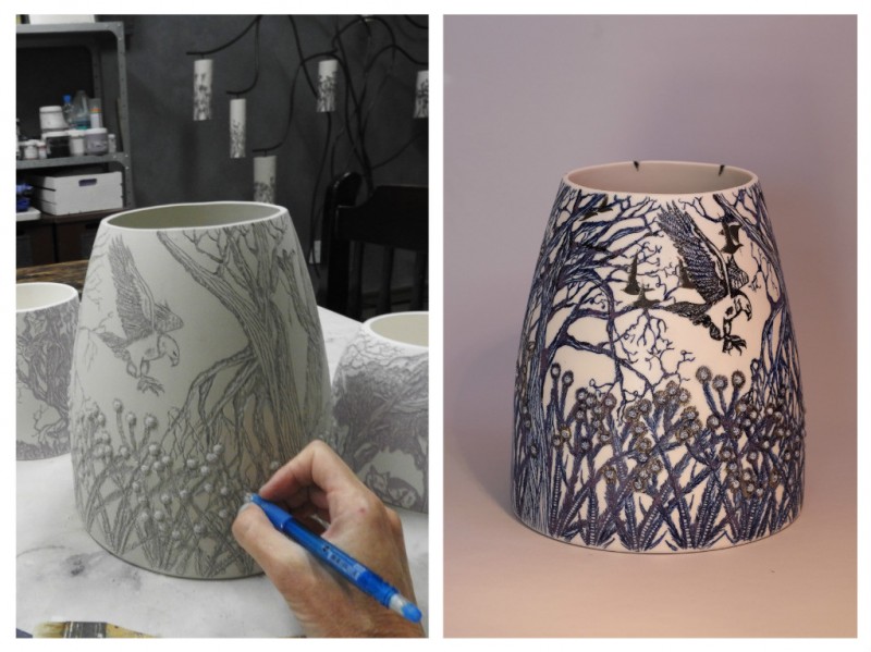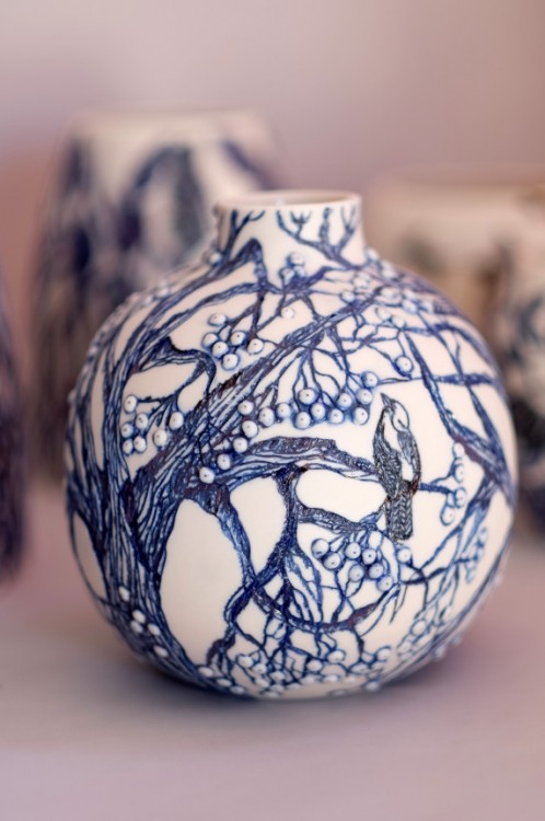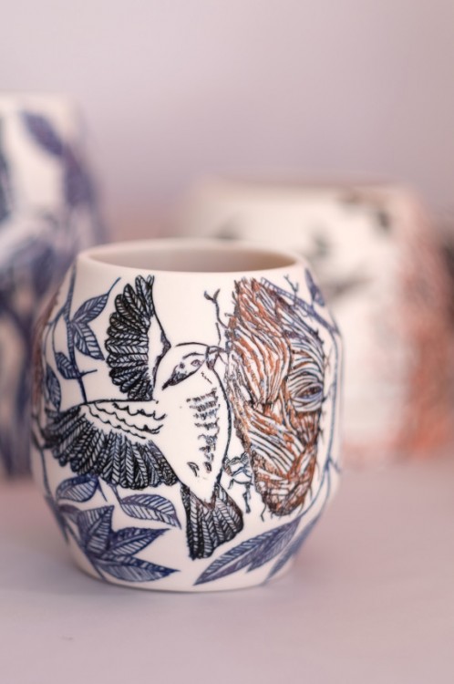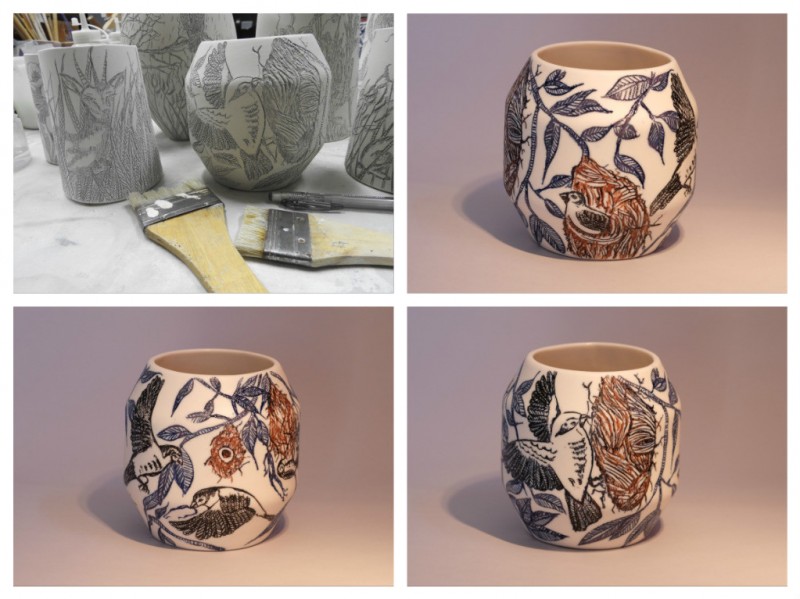 I like to illustrate through "clay etchings" on the form, a world in which small acts of everyday life reveals itself in fine detail.