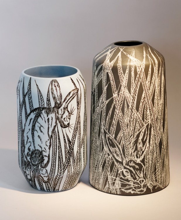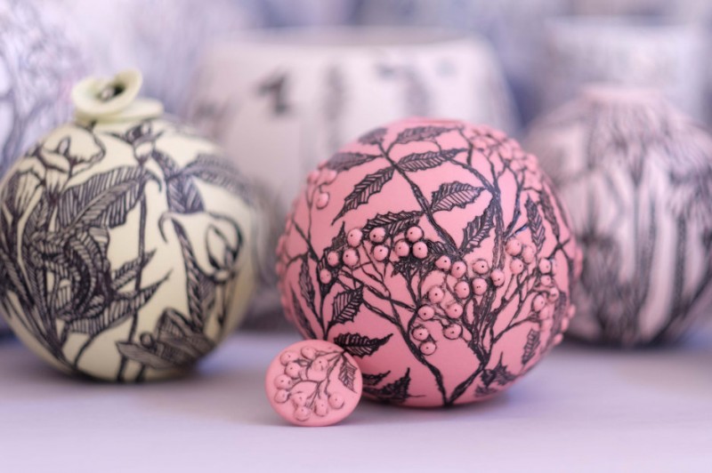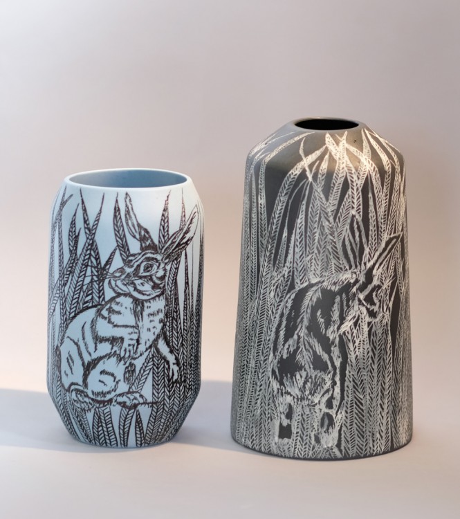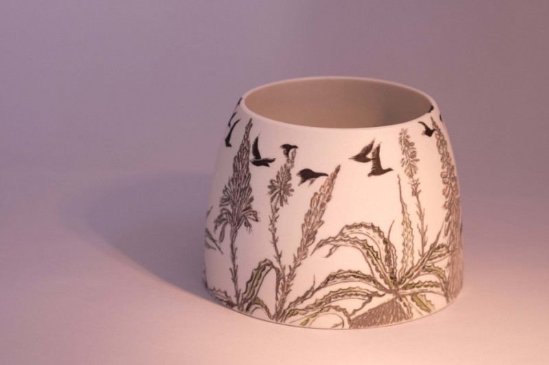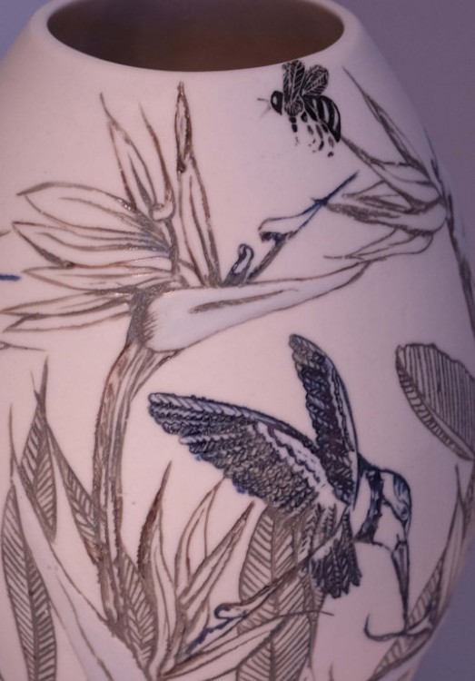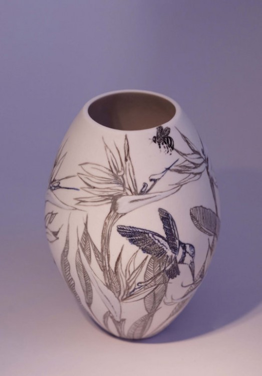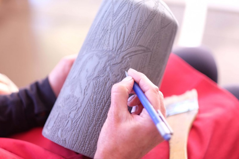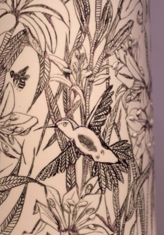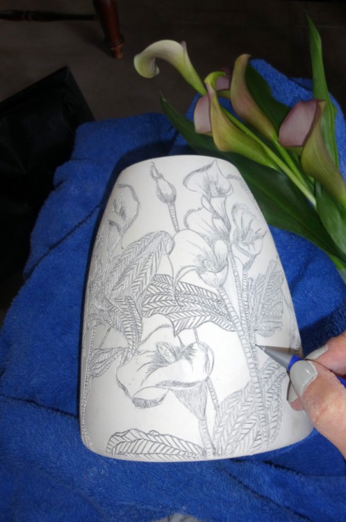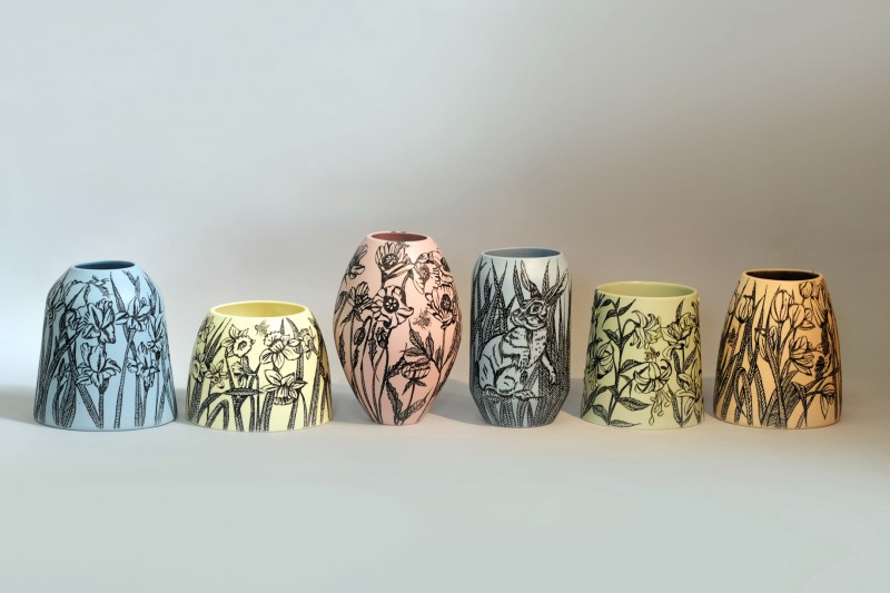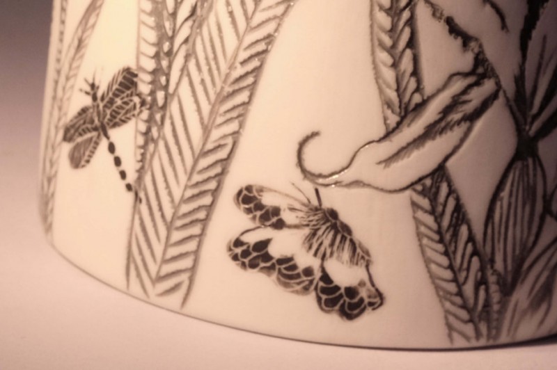 I like to illustrate through "clay etchings" on the form, a world in which small acts of everyday life reveals itself in fine detail.