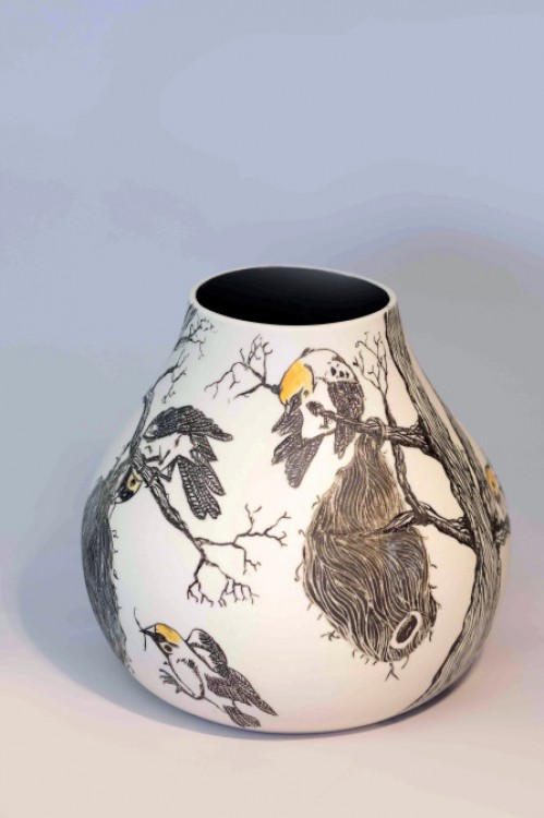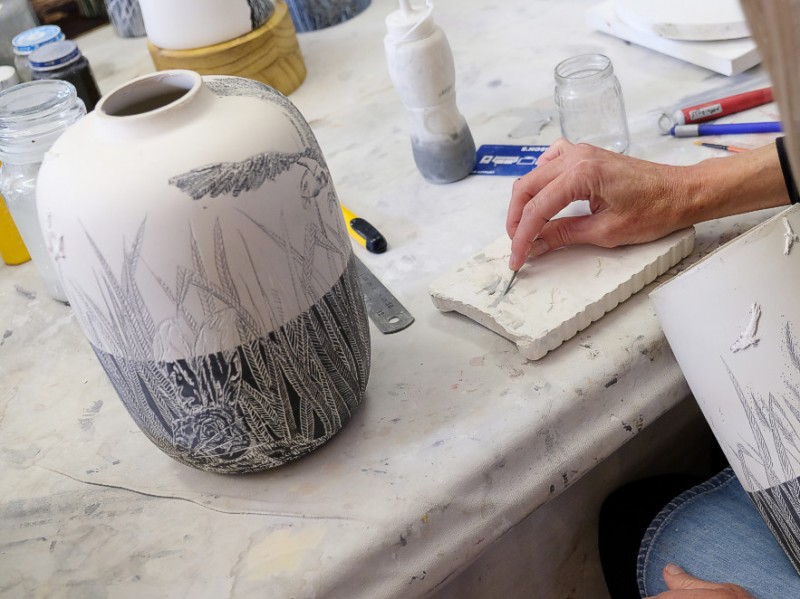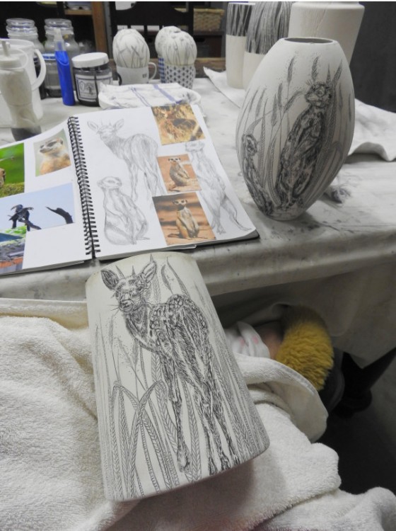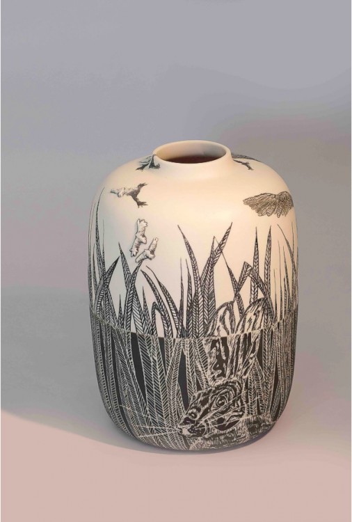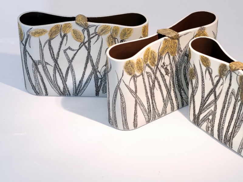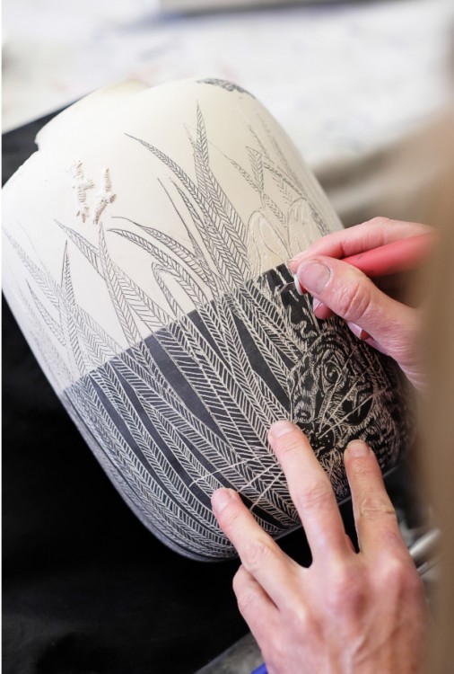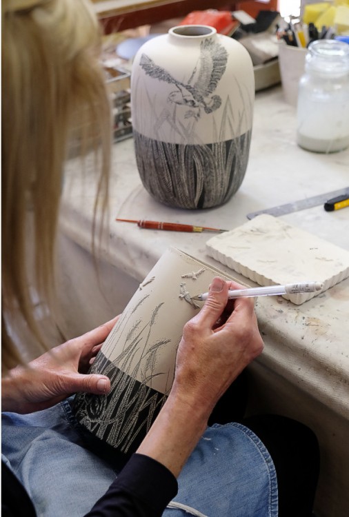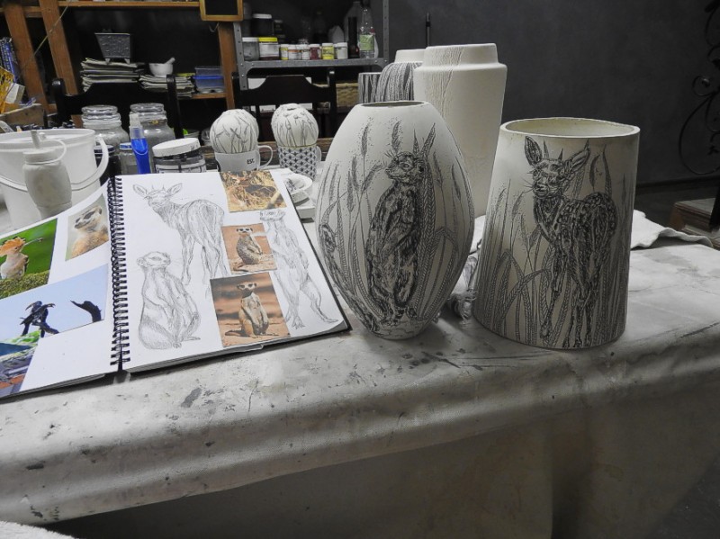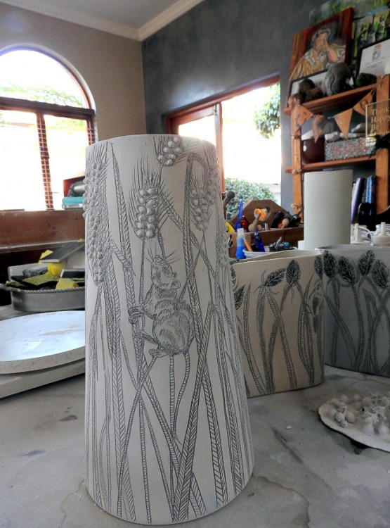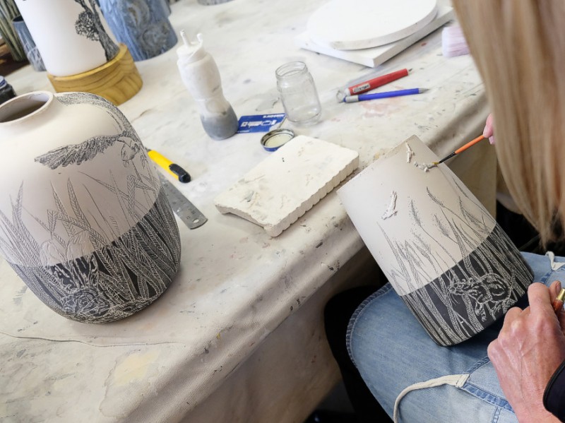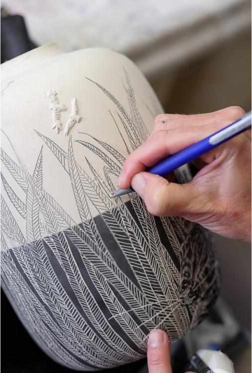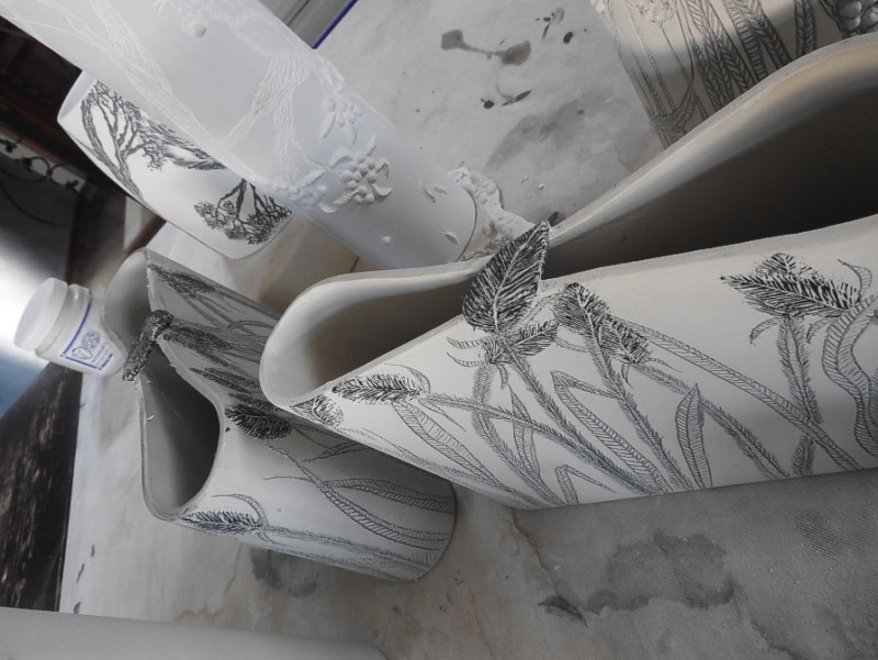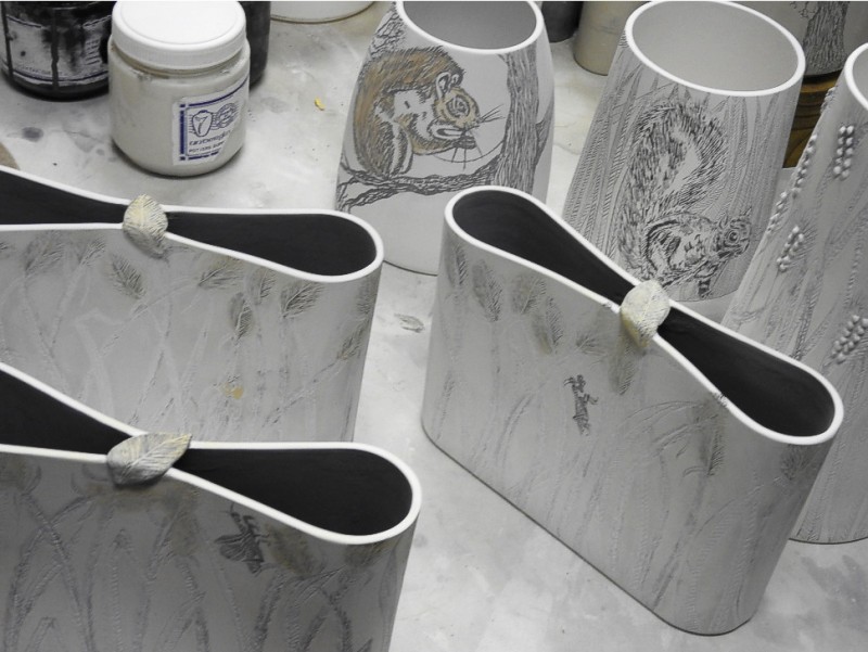 I like to illustrate through "clay etchings" on the form, a world in which small acts of everyday life reveals itself in fine detail.