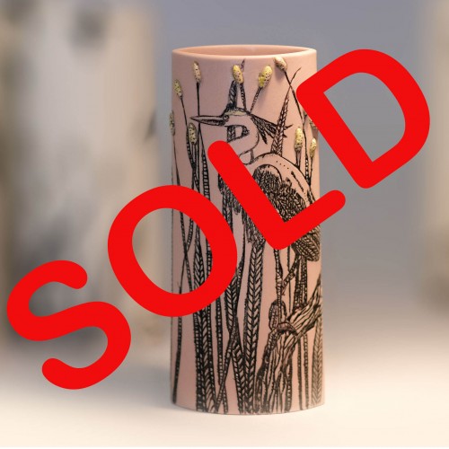 15cm high. Orange porcelain with blue etching, bird sprigs and painted birds.