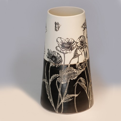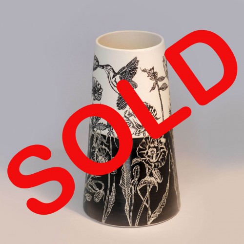 25cm high. White porcelain with black etching, reverse etching with sprigs and painted birds...