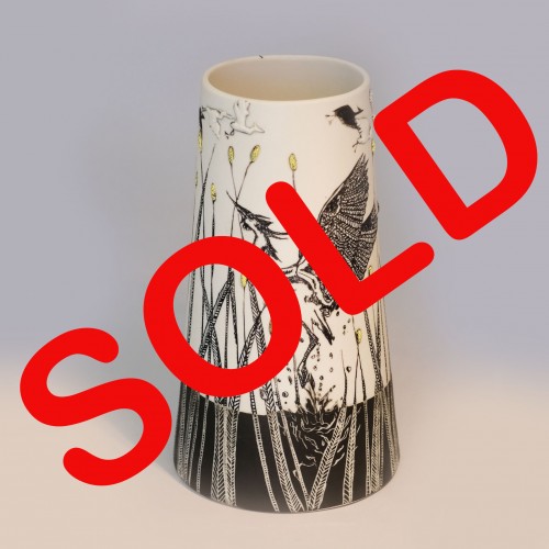 25cm high. White porcelain pot with black etching, reverse etching and painted colour...