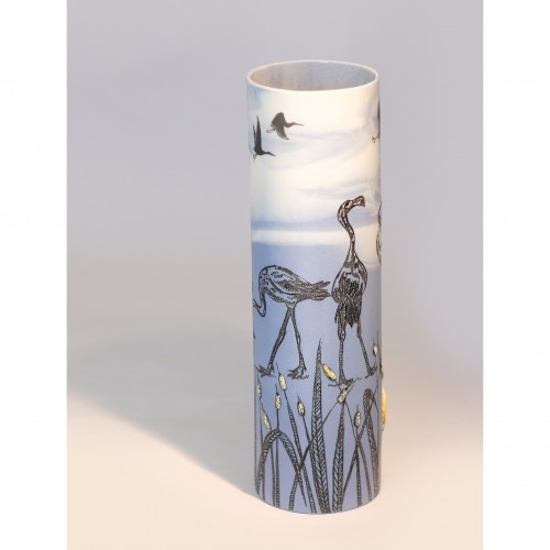 27cm high. Green marble coloured porcelain with black etchings, sprigs and painted birds...