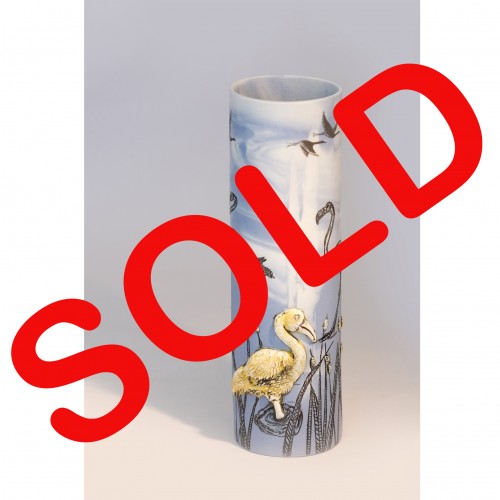 27cm high. Peach marble coloured porcelain with black etchings, sprigs and painted birds...