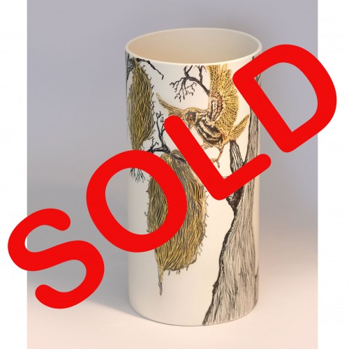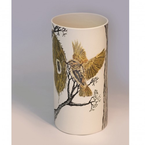 25cm high. White porcelain pot with black etching, reverse etching and painted colour...