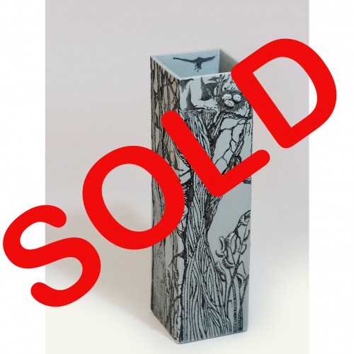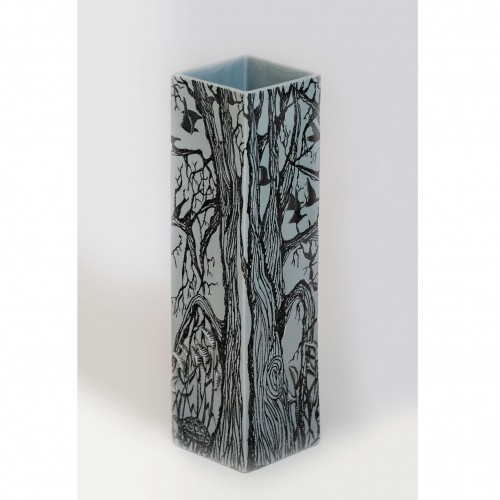 31cm high. White porcelain with black etching, sprigs painted insects and gold lustre in third firin..