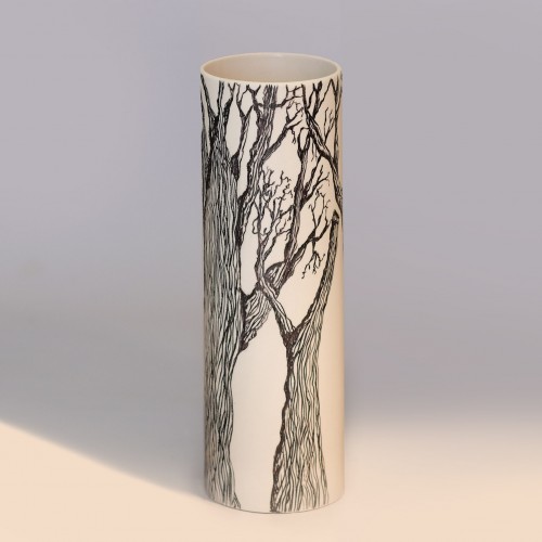 27cm high. White porcelain pot with black etching, reverse etching and painted colour...