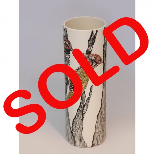 25cm high. White porcelain with black etching, reverse etching with sprigs and painted birds...