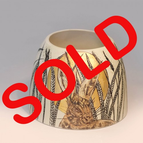 12cm high. White porcelain pot with black etching, reverse etching and painted colour with gold lustre firing.