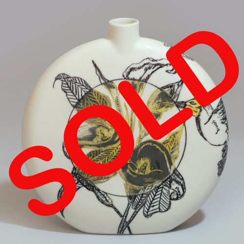 15cm high. White porcelain with black etching, reverse etching and painted insects...